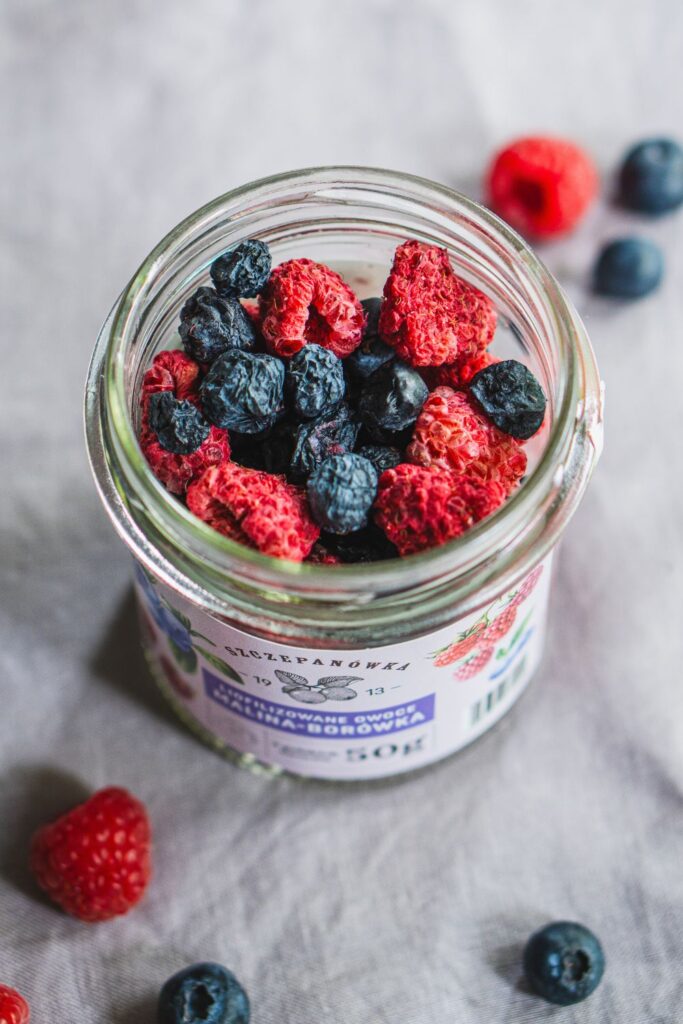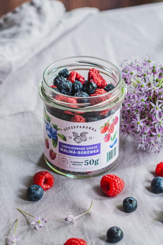 Nasza mieszanka liofilizowanych malin i borówek to 100% ręcznie zbieranych owoców z rodzinnego Gospodarstwa Ogrodniczego Szczepanówka. Powstała z troską o najwyższą jakość i naturalność. Dzięki procesowi liofilizacji owoce zachowują swój intensywny kolor, aromat, smak i cenne składniki odżywcze – błonnik, witaminę C i antyoksydanty.