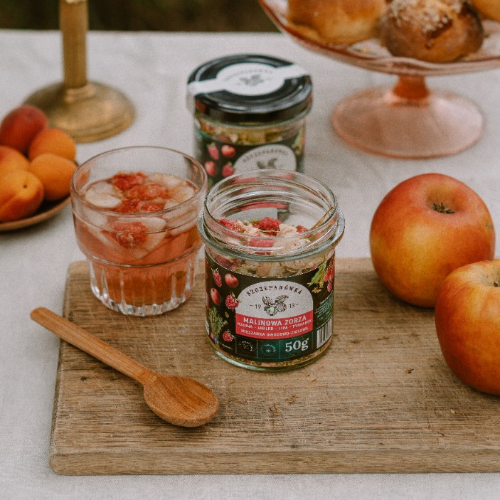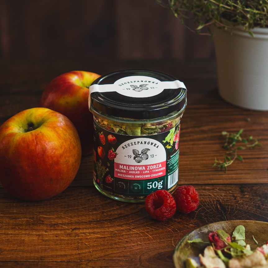 Rozgrzewająca kompozycja malin, jabłek, aromatycznych ziół i przypraw. Malinowa Zorza to smak późnego lata zamknięty w szklanym słoiczku – naturalna mieszanka liofilizowanych owoców i ziół z dodatkiem przypraw korzennych. Bez dodatków, bez konserwantów – tylko natura ze Szczepanówki.