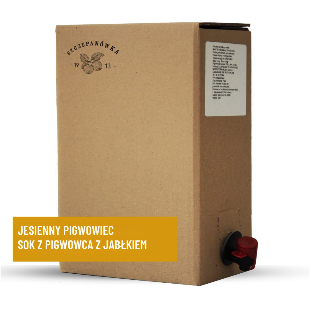 Bag-in-box (worek w kartonie) – wyposażony w specjalistyczny kranik umożliwiający precyzyjne nalewanie soku prosto do szklanki. Prosimy pamiętać, że po otwarciu kranik zawsze powinien być zalany sokiem, co gwarantuje świeżość produktu.