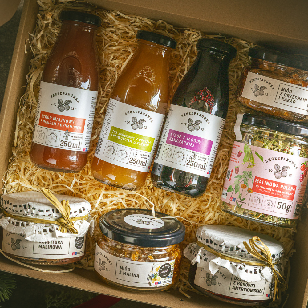 - 8 produktów ze Szczepanówki, w tym m.in. syropy, sok, miody, konfitura, dżem i herbatkę ziołowo-owocową.